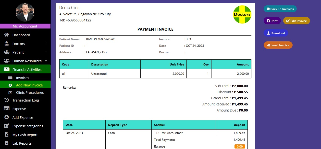 Financial reports allow easier auditing and bookkeeping. See doctor earnings, daily cash positions of staff, patient payments, invoices.